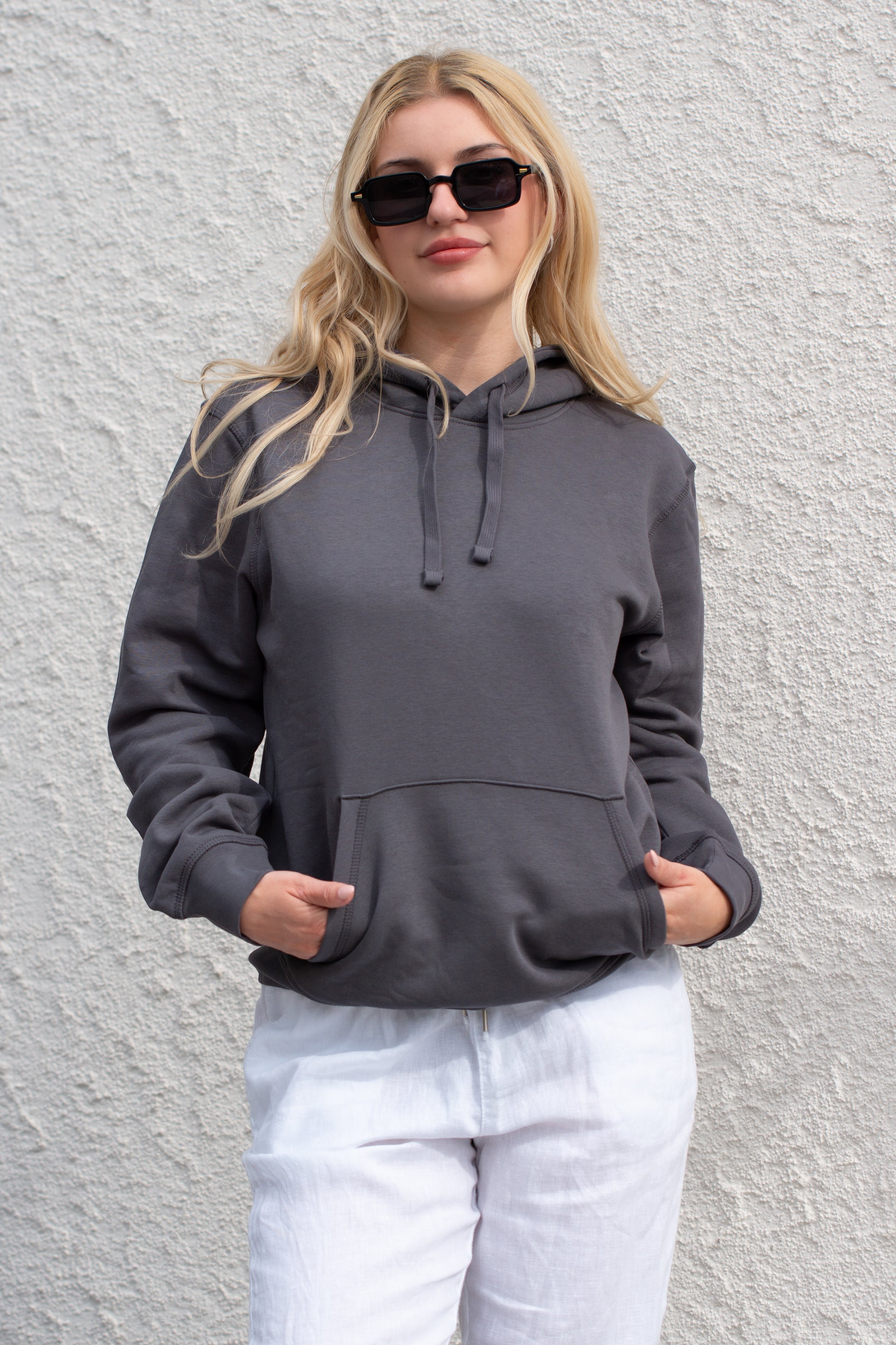 Unisex-Hoodie | Flache Zugkordeln in passender Farbe | Gestickte Knopflöcher | Flatlock-Steppnähte an allen Säumen | Kängurutasche mit Flatlock-Steppnnaht